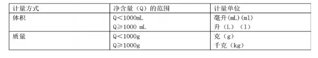 GB7718《預(yù)包裝食品標(biāo)簽通則》4.1.5.3的規(guī)定:凈含量計(jì)量單位的標(biāo)示方式,如下表: